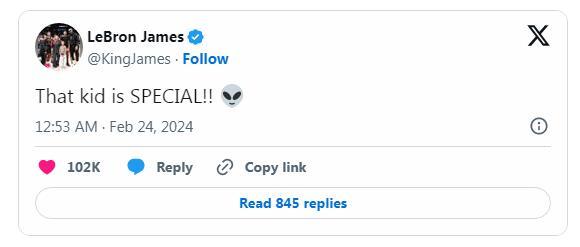 作为对手和文班亚马的前辈,勒布朗·詹姆斯在赛后高度赞扬了文班亚马,“他的才能是没有上限的” 勒布朗说:“他可以在职业生涯中做任何他想做的事情。在我看来,他很享受篮球。他精力和时间都投入进去了……我很久以前就说过他是多么特别,现在大家都能看到他有多特别。”