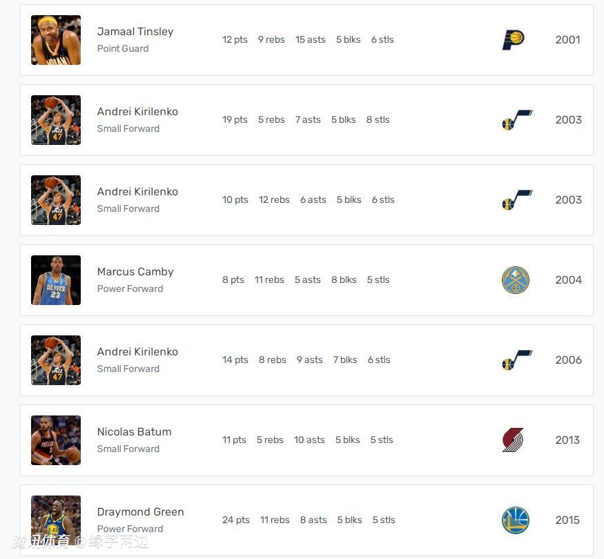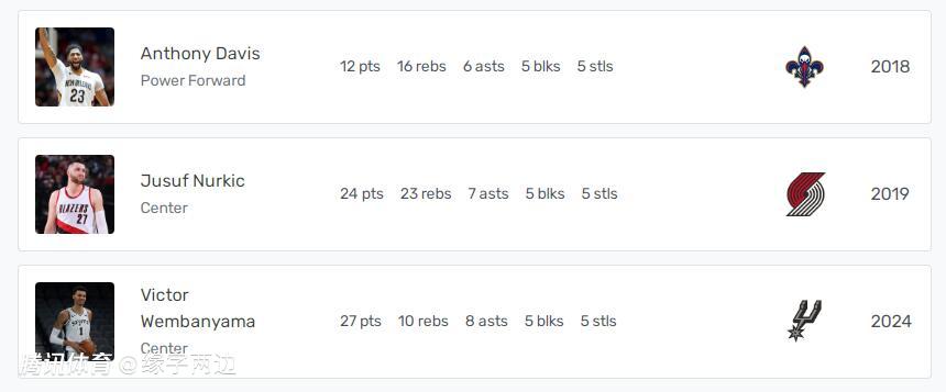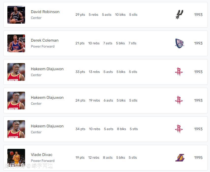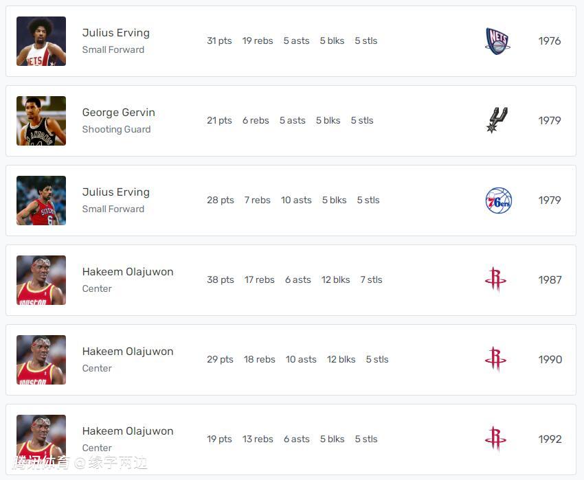 Dr. J-朱利叶斯·欧文,大梦-奥拉朱旺,AK47—安德烈·基里连科,一个个著名球星的姓名组成了NBA的5X5记录榜,这个榜所记录的是一个时代里最全能的明星,他们能得分,能抢篮板,能助攻,能抢断,他们还能盖帽;在马刺的历史里曾有两个名字被记录在这个榜内:1979年的冰人-乔治·格文;还有1993年的海军上将-大卫·罗宾逊;在2024年2月23日晚,马刺对阵湖人的比赛中,马刺球员文班亚马以27分,10篮板,8助攻,5封盖,5盗球正式被记录入这个名单以内。