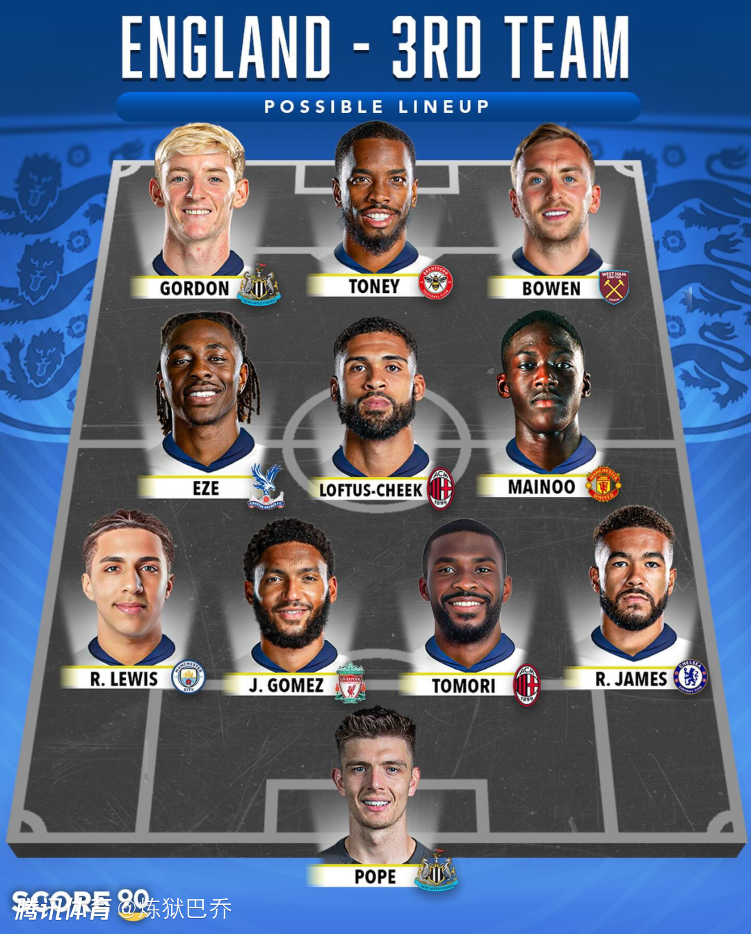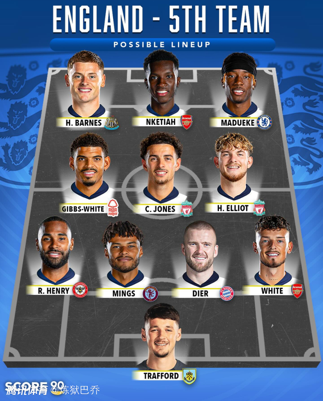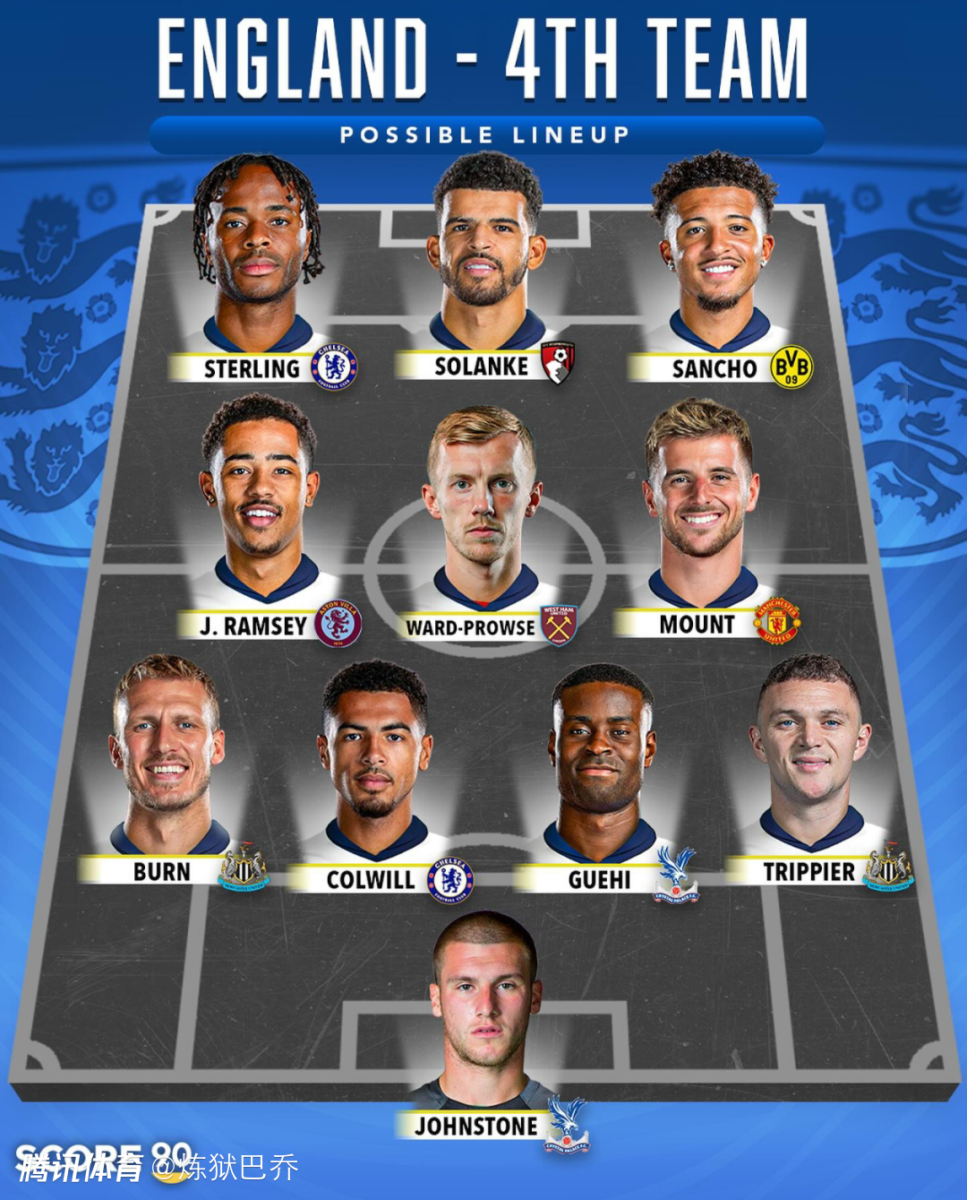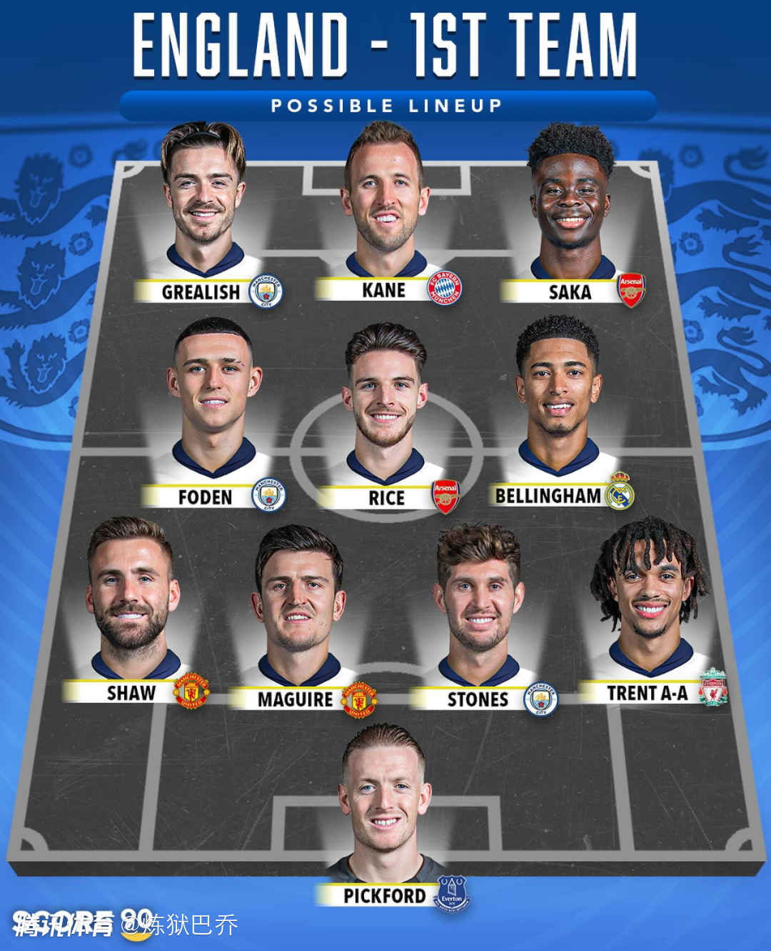 英格兰的五套阵容第一阵容中前场世界顶级五