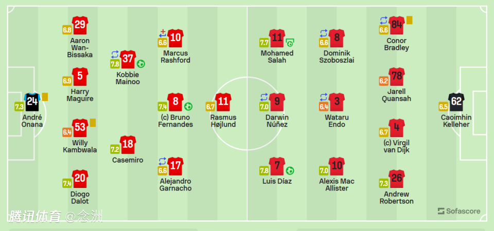 利物浦(433):62-凯莱赫;84-布拉德利(66’2-戈麦斯),78-宽萨,4-范迪克,26-罗伯逊;8-索博斯洛伊(66’17-琼斯),3-远藤航(69’19-埃利奥特),10-麦卡利斯特;11-萨拉赫,9-努涅斯(69’18-加克波),7-迪亚斯