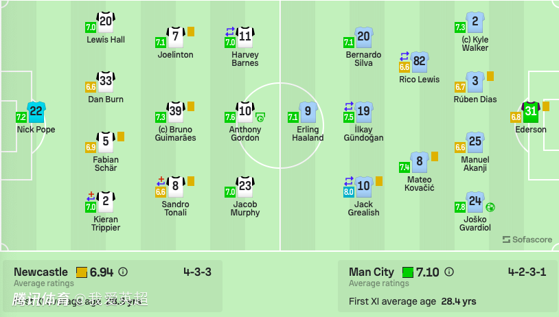 曼城首发:31-埃德森、2-沃克、3-迪亚斯、24-格瓦迪奥尔、25-阿坎吉、82-刘易斯(81'11-多库)、8-科瓦契奇、19-京多安(66'47-福登)、10-格拉利什(81'26-萨维尼奥)、20-B席、9-哈兰德
