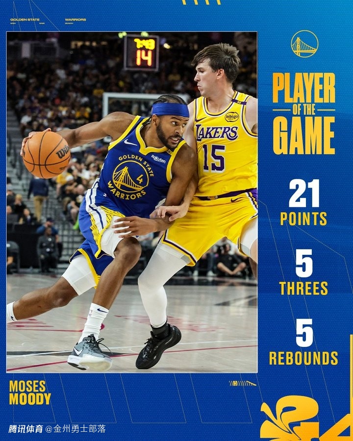 10月16日 NBA季前赛,勇士111-97战胜湖人。赛后,勇士官方将赢球海报的封面人物给了穆迪,而本场的最佳也选了穆迪。本场比赛,勇士后卫穆迪表现非常出色,打了19分钟13投7中(三分7中5)、罚球2中2,拿到全队最高21分外加5篮板2助攻,正负值高达+17。也许您还喜欢:世界杯直播 亚洲杯直播 欧洲杯直播 足球直播