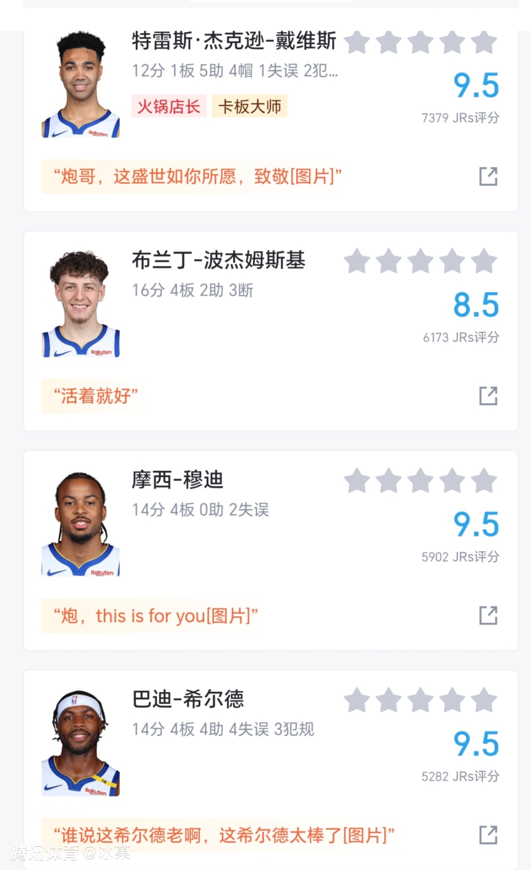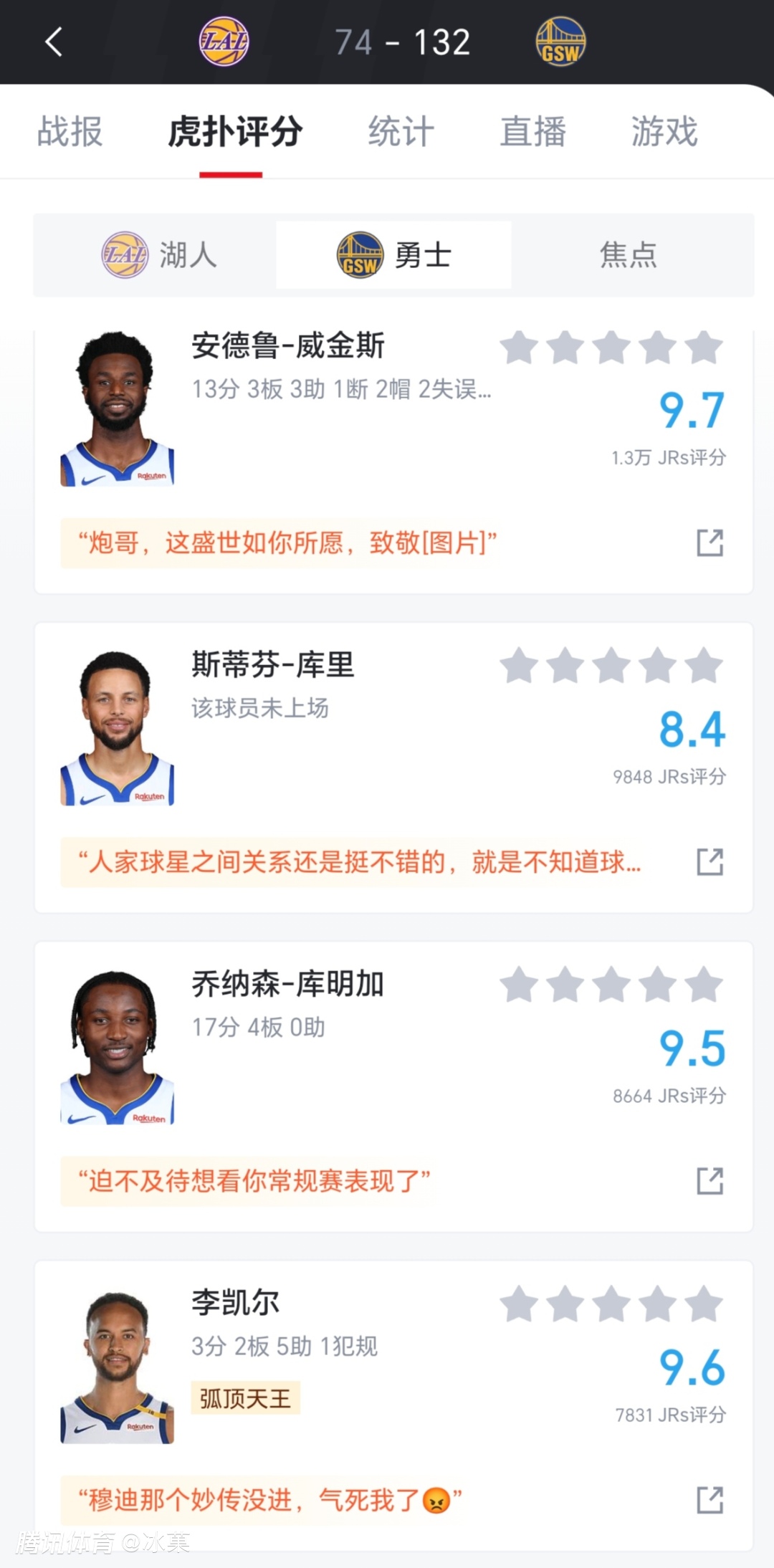 NBA季前赛继续~北京时间10月19日湖人vs勇士二番战!最终74-132勇士拿下比赛,本场比赛湖人球员詹姆斯,戴维斯等没出战,勇士球员库里没上场。维金斯13分,库明加17分,希尔德14分,穆迪14分,波杰姆斯基16分。NBA常规赛马上开始!期待勇士队的表现。#58分惨败!布朗尼17分湖人负勇士#也许您还喜欢:世界杯直播 亚洲杯直播 欧洲杯直播 足球直播