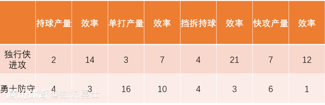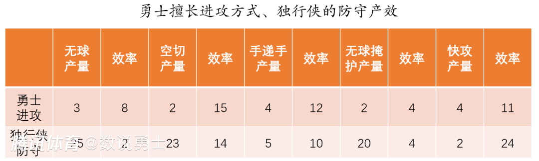 从上表独行侠擅长进攻方式、勇士的防守产效来看,独行侠擅长的持球进攻刚好是本赛季勇士擅长防守的,特别是在挡拆持球上勇士的外线领防人能挤过掩护甚至突然采取包夹策略,但通常会放任球员单打并凭借锋线的长臂干扰。