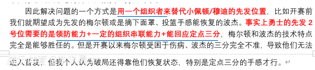 为什么梅尔顿会是勇士先发的一个好方案,这一点我在上场对骑士的复盘中有做过总结,因为勇士需要一个能领防+组织串联+能回应定点三分的二号位,而赛季至今的先发二号位并不能满足全部条件——维金斯能领防有三分,但他无法组织串联,在库追连线被针对后只能靠自己强攻得分;穆迪有三分但是组织串联是短板、领防时灵时不灵;小佩顿能领防、但后两个不行,所以这几个人无论谁放2都感觉首发阵容缺东西。