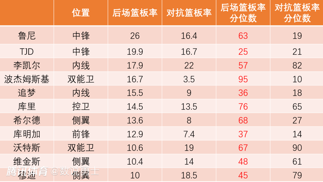 那么本场比赛疯狂丢篮板被追分的阵容是什么呢?第一套是波杰+穆迪+希尔德+库明加+李凯尔,李凯尔打中锋篮板率不够看、库明加和穆迪低于同位置、希尔德和库明加抢篮板不爱对抗,波杰又在外线轮转换位,篮板控制不住也就不奇怪了。