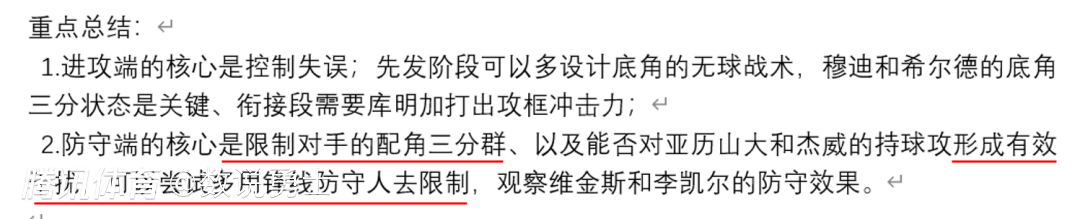 ? 1.进攻端的重点是打好无球进攻、利用好放空的底角三分,在独行侠相对不擅长的空切和无球掩护领域打出针对性,莱夫利不在场时需要打出攻框威力;