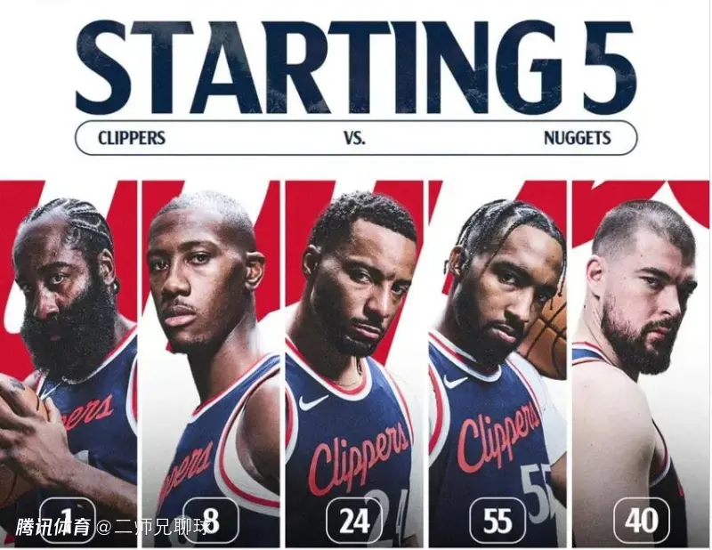 快船对阵掘金首发:哈登、邓恩、鲍威尔、小琼斯、祖巴茨