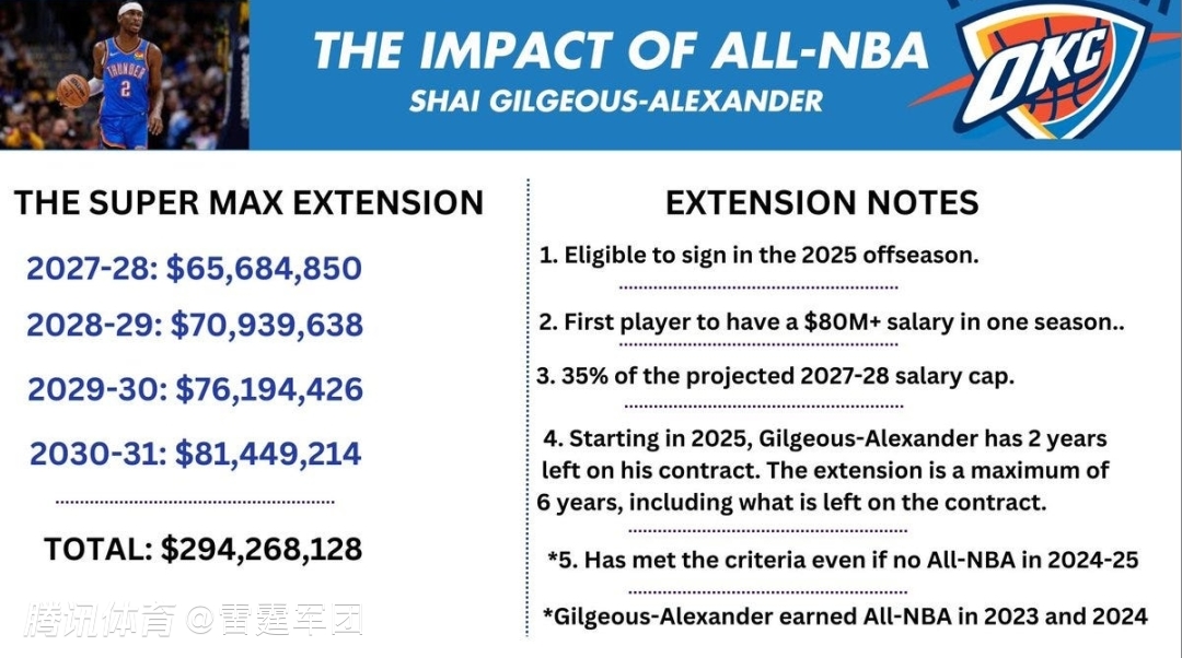 据报道,亚历山大目前的合同将于2027年到期,他有资格在2025年与雷霆签下一份为期4年的提前续约合同。由于亚历山大在2023年和2024年都已经进入过最佳阵容,所以他已经获得了签下超级顶薪的资格。