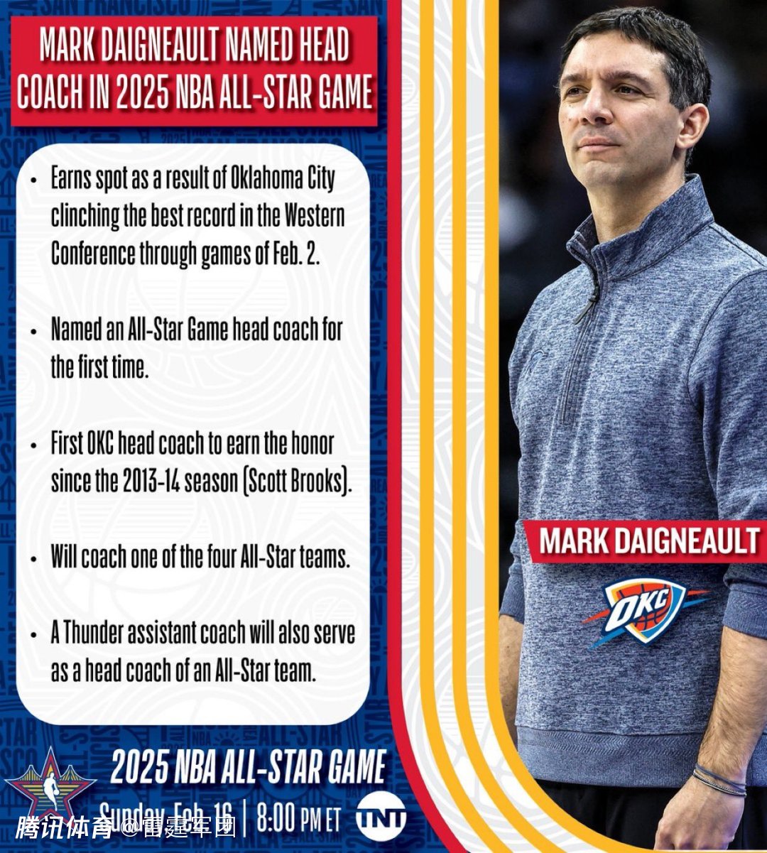戴格诺特锁定全明星主帅!根据NBA官方规定,全明星主帅确定截点是2月3日,而雷霆队已经在这个截点确保西部第一。NBA官方宣布,雷霆主帅戴格诺特提前锁定全明星主帅,将执教四支全明星队中的一支。同时,一名雷霆助教也将执教其中一支全明星队。也许您还喜欢:世界杯直播 亚洲杯直播 欧洲杯直播 足球直播