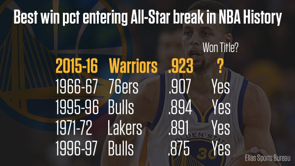 勇士今日客场战胜太阳后,前52场比赛的战绩已经来到48胜4负,这是历史上前52场比赛的最佳战绩。值得一提的是,48胜4负(92.3%的胜率)也是史上全明星赛前的最佳战绩:1966-67赛季76人 胜率90.7% 夺冠1995-96公牛 胜率89.4% 夺冠1971-72湖人 89.1% 夺冠1996-97公牛 87.5% 夺冠2015-16勇士 92.3% ? 史上这些全明星赛战绩最好的球队最终...