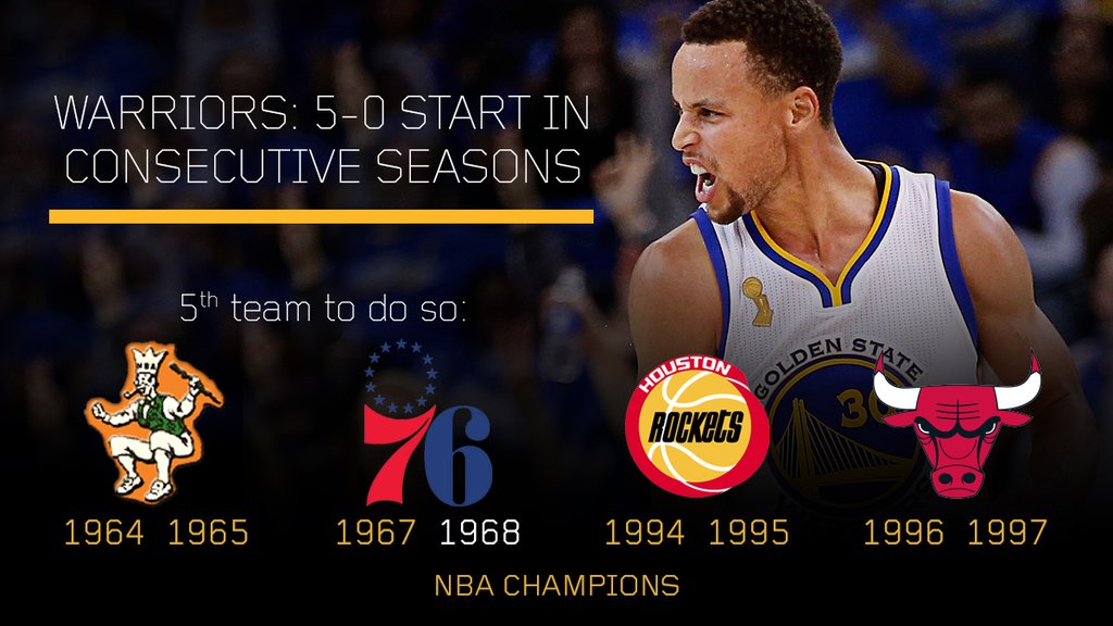 连续两个赛季以5连胜开局,历史上只有4支球队做到过,1964&1965年凯尔特人, 1967&1968年76人,1993&1994年火箭,以及1996&1997年的公牛勇士本赛季前五场战绩为:111-95战胜鹈鹕,112-92战胜火箭,134-120战胜鹈鹕,119-69战胜灰熊,112-108战胜勇士勇士上赛季前五场战绩为:95-77战胜国王,127-104战胜湖人,95-90战胜开拓者,121-104战胜快船,98-87战胜...