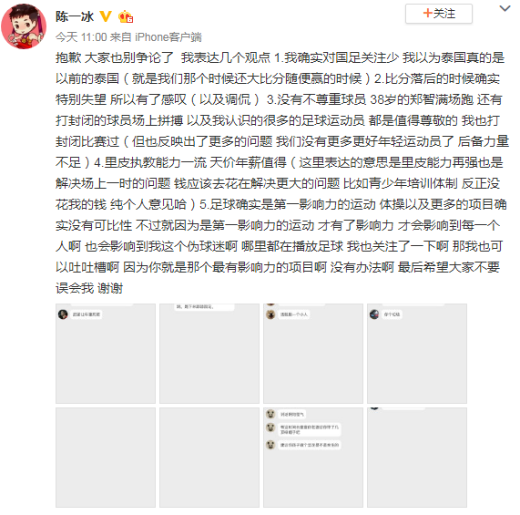 国足2-1逆转泰国挺进亚洲杯八强之后,已经退役的中国体操名将、奥运冠军“吊环王”陈一冰在个人微博中谈到了一些自己对国足的看法,此后他遭到了大量网友的辱骂,今天他表示了歉意。