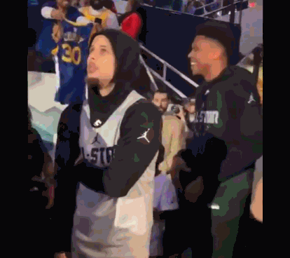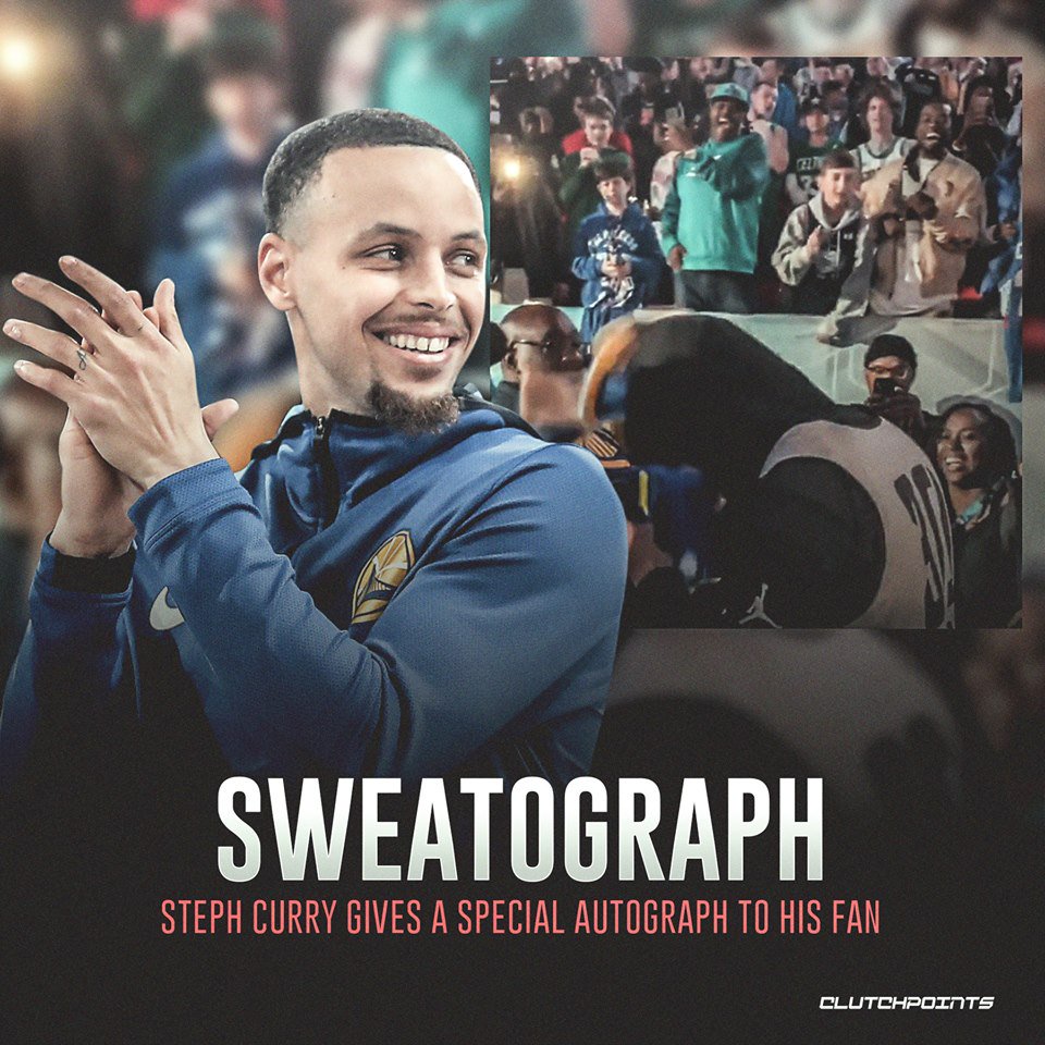 一位疯狂的粉丝挥舞球衣让库里签名,库里让他把球衣扔过来后库里把球衣在带着帽子的头上蹭了两遍后扔给了球迷,球迷十分激动向其他人显摆。