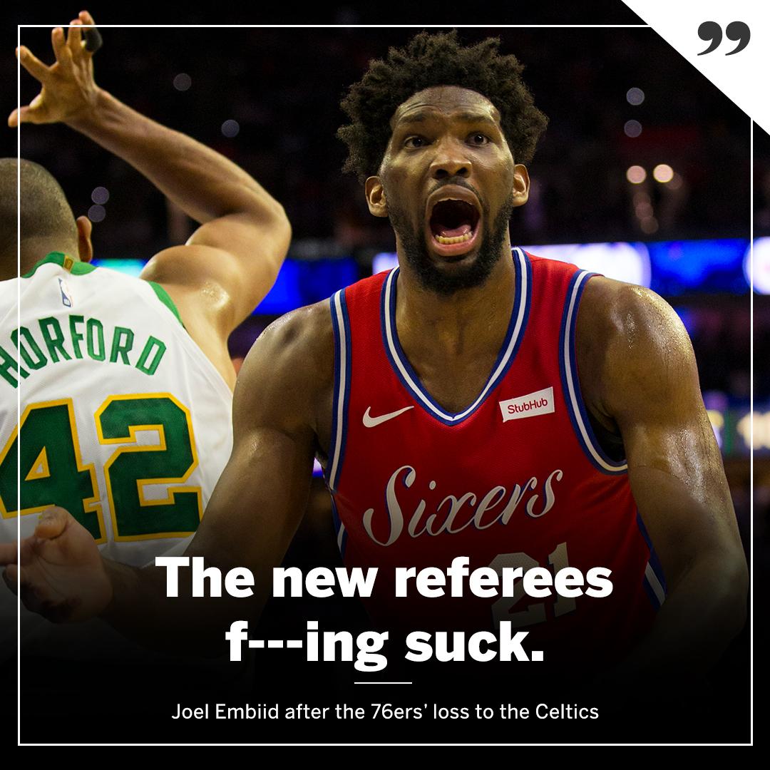 赛后,费城体育记者爆料,赛后恩比德宣泄了对今晚裁判吹罚的不满,恩比德说到:“裁判糟糕透了”,随后恩比德便离去。恩比德似乎是在对在比赛最后时刻对位霍福德时,没有得到哨子感到沮丧,恩比德这一行为预计会遭到联盟罚款。