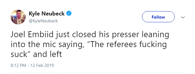 恩比德似乎是在对在比赛最后时刻对位霍福德时,没有得到哨子感到沮丧,恩比德这一行为预计会遭到联盟罚款。