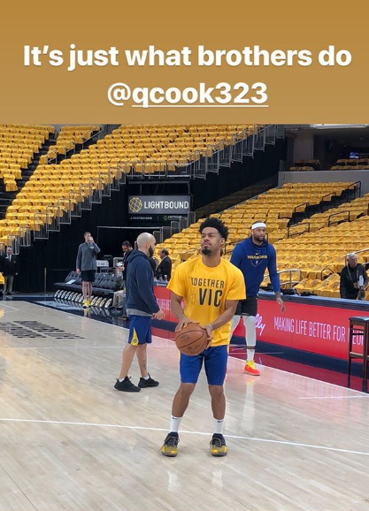 据报道,勇士队的考辛斯和库克也在热身时穿上了这件T恤。奥拉迪波也在社交媒体上对两位勇士球员表示感谢:“谢谢我兄弟@库克的行为,感谢我兄弟@考辛斯的爱。”
