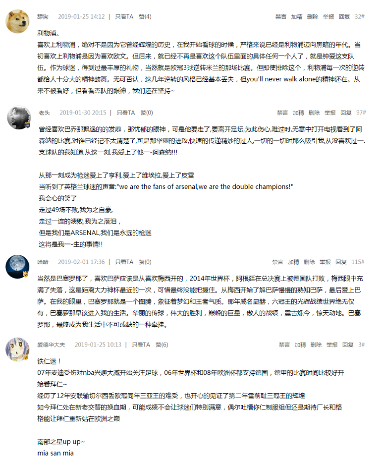 比如第21楼、第51楼和第117楼让我们看到了对C罗的坚持;第51楼和第87楼让我们看到了对“You never walk alone”的信仰;第105楼喜欢斯旺西的小伙伴让我们看到了英超别样的天鹅美;第120楼让我们看到了对银河战舰的笃定。