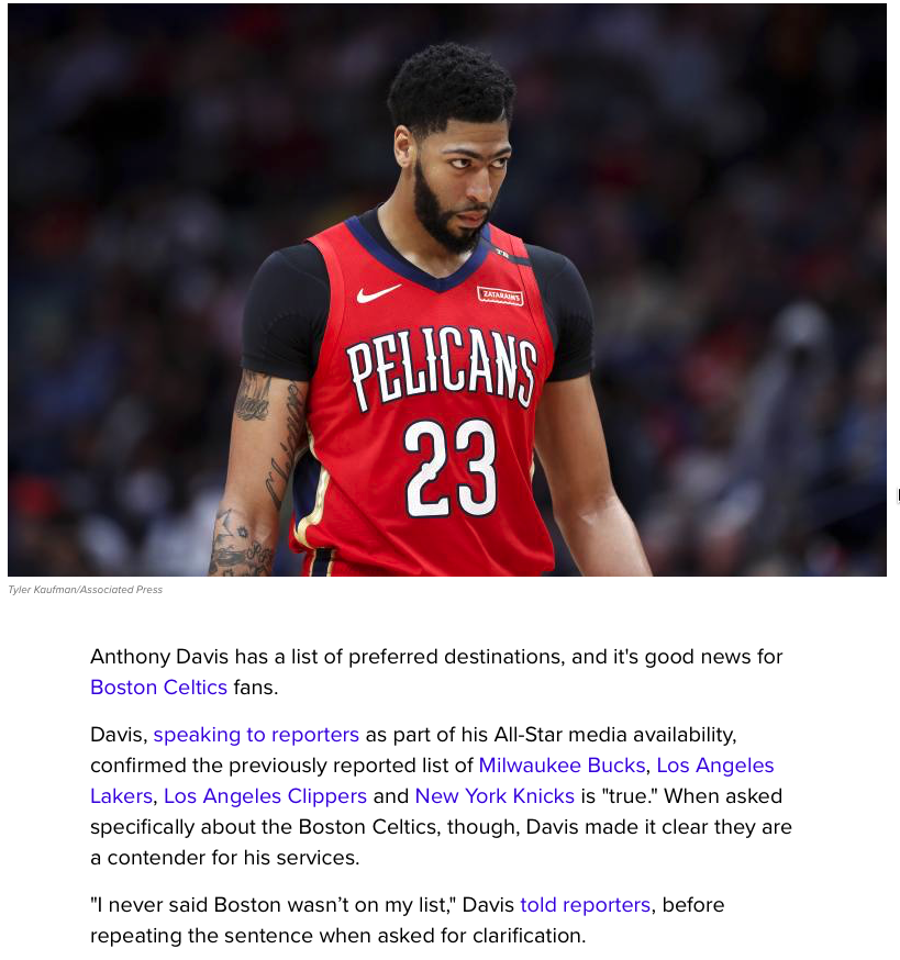 浓眉哥还承认,之前沃神爆出他的下家名单都是真的:湖人、尼克斯、雄鹿和快船。