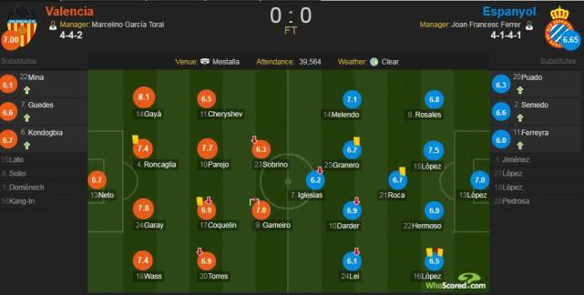 西班牙人0比0战平巴伦西亚,我国球员武磊获得了首发机会,在第71分钟被换下。但在两大网站赛后的评分里,武磊都排名球队倒数第一。whoscored的评分中,武磊是6.1分,Espanyol更是只有5.8分!你认为这个评分合理吗?武磊是不是适合替补出战?