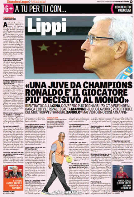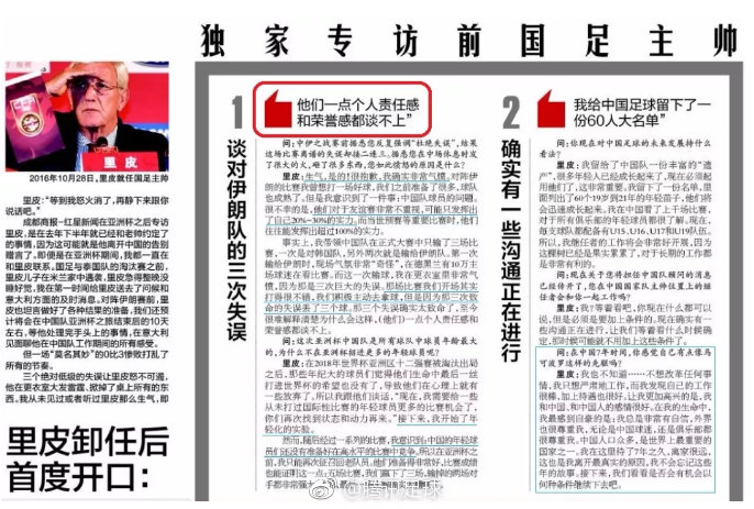 “中国球员一点责任荣誉感都没有!”这是此前国内媒体对里皮专访中的一句话,国内各大媒体纷纷转载刊登引爆话题,包括著名媒体人@董路在内,都对“里皮狠批国脚”展开热议。针对该篇专访内容,腾讯体育与原作者《米兰体育报》记者利卡里进行核实求证,事实证明——里皮被冤枉了,他的原话并非如此。(@小五在米兰)O里皮被...也许您还喜欢:世界杯直播 亚洲杯直播 欧洲杯直播 足球直播