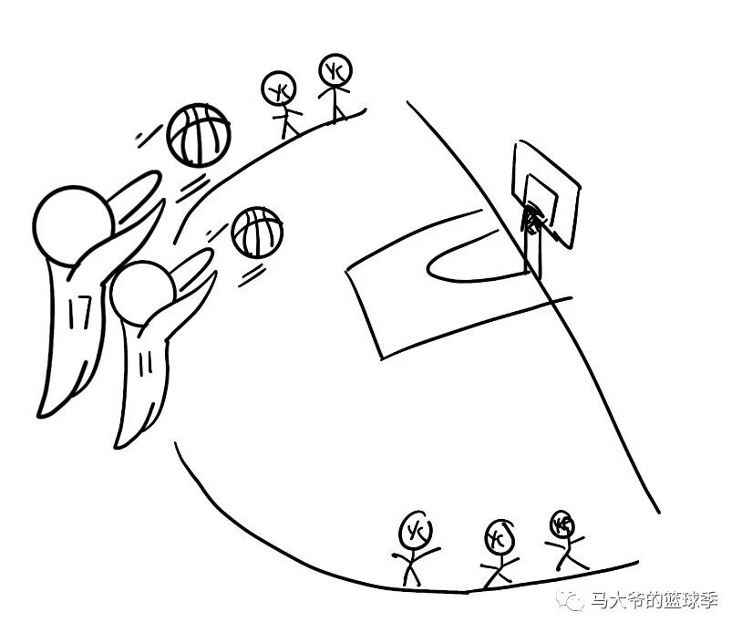当瓦兰转过身时他顺利的把球传给了底角的卡波克洛,这时候请大家注意,在哈登去包夹的过程中香波特在用手指着卡波克洛,提醒塔克底线漏人,这是场上沟通的细节。