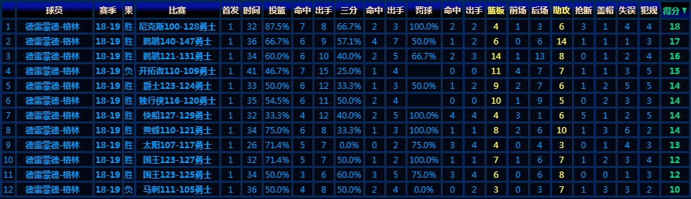 因为强援加盟和自身状态下滑,格林本赛季场均仅能得到7分。但在他本赛季得分上双的比赛中,勇士取得11胜2负的战绩。