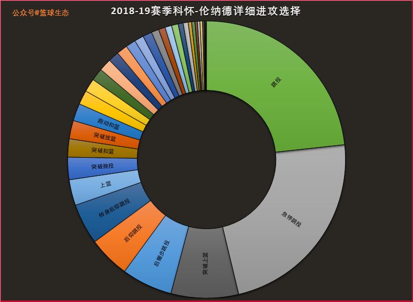 这张图里,我利用官网的PBP数据,统计伦纳德了更为精细的进攻方式。从中我们可以看到,扎实的投篮给了伦纳德很大帮助,不论是寻常跳投,还是转身、后仰、转身连后仰、后撤步,在一通操作之后,把球弄进去才是王道,而伦纳德正擅长利用各种脚步创造空间之后把球投进去。