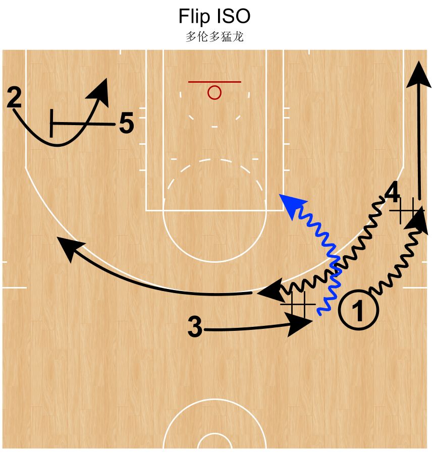 比如这样,3号伦纳德弧顶看,弱侧2号5号拉开再走个掩护以便让弱侧谢方哲不敢轻举妄动。