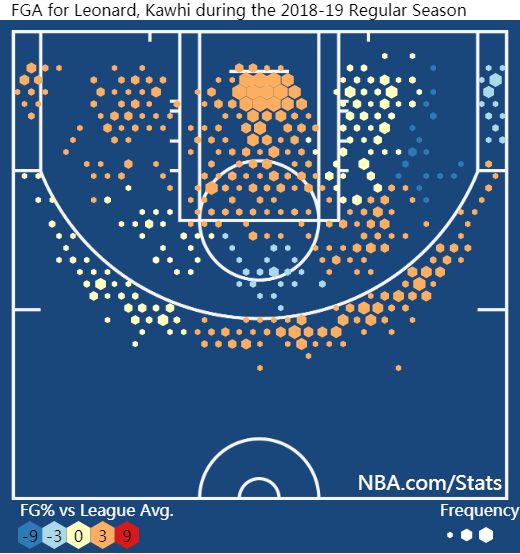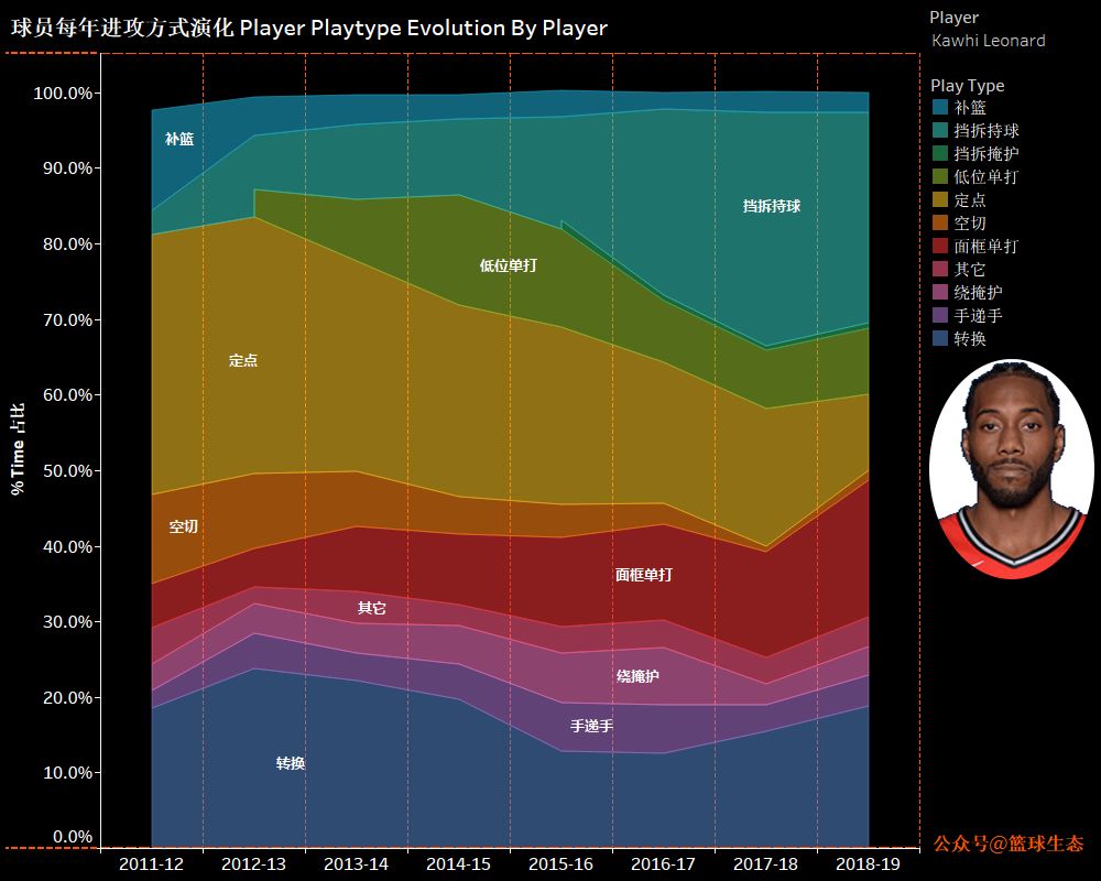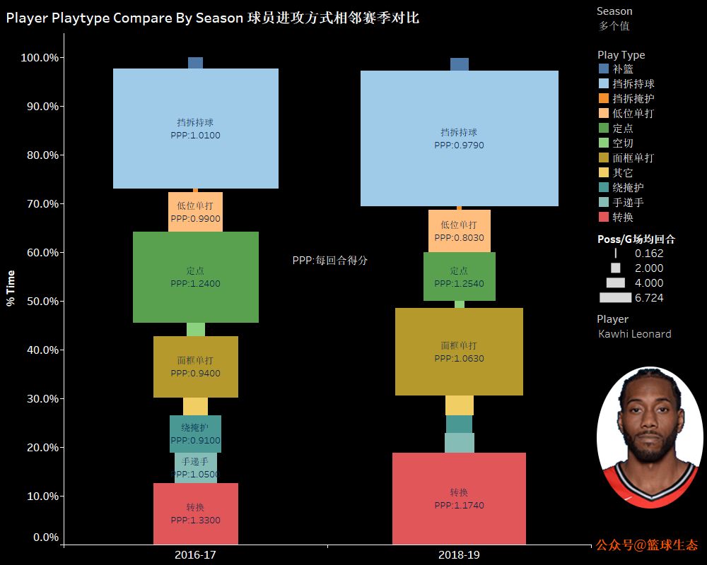 不过纳斯教练也不是一味让伦纳德攻坚,在鼓励转换的理念下,伦纳德打了比在马刺多得多的转换进攻,这有利于他维持良好的整体效率。