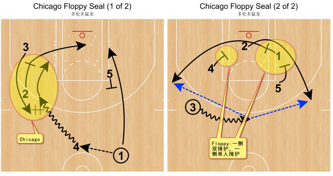再复杂点,猛龙用得最多的是Chicago,一个单挡掩护切出再一个手递手就地挡拆。