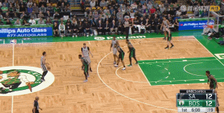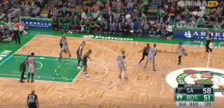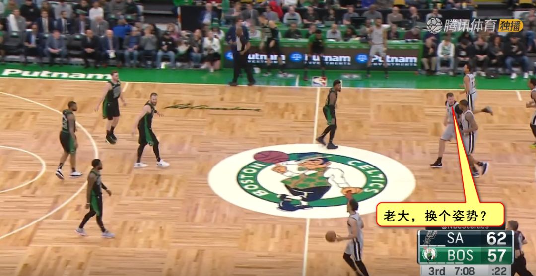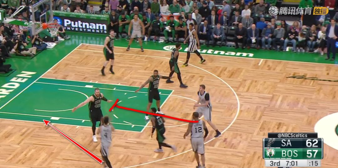马刺本场第四次玩这个战术,绿军已经有了防备,阿德借福布斯内切的掩护被贝恩斯提前推至低位破解。