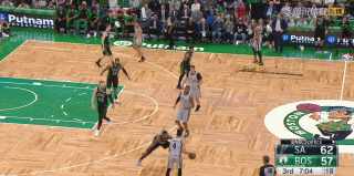正常跑战术跑了几次了,绿军也免疫了,那换换吧:1号和双塔站持球双掩护位,5号却换了掩护角度,打了Give & Go,然后1号和4号双鬼拍门压缩防线,5号笑纳空位中投。