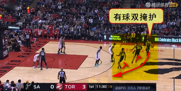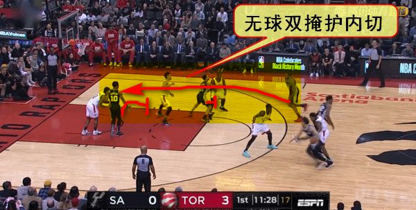 ——持球双掩护,一内切,一外切是最理想的选择,要求外切项能远射,博尔特尔不具备这项能力,因此马刺这样走战术,直接目的还是指向阿德低位单打。