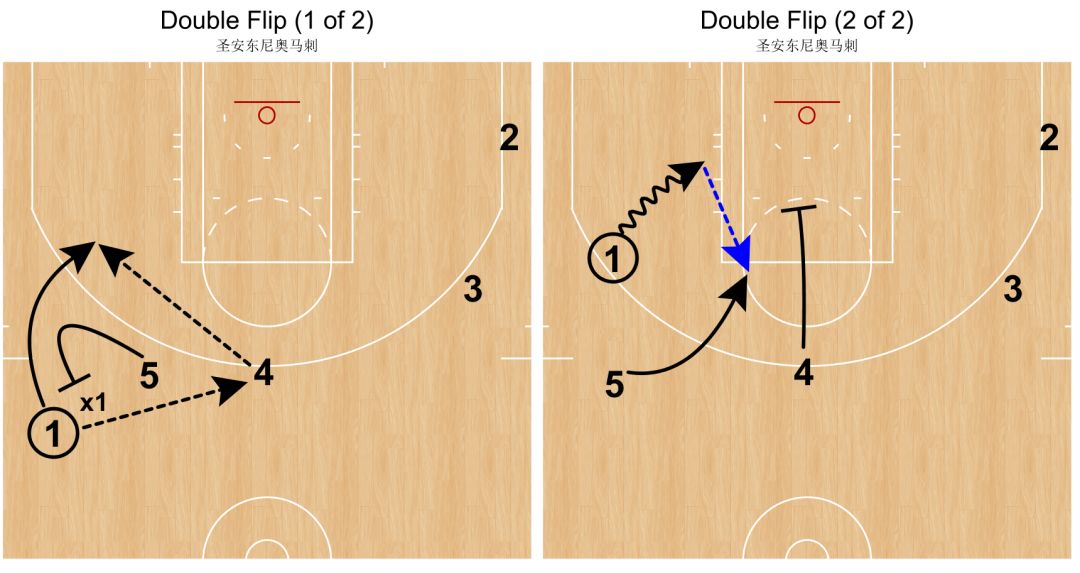 1号弧顶持球,借双掩护向左移动,4号借2号向上掩护无球内切。