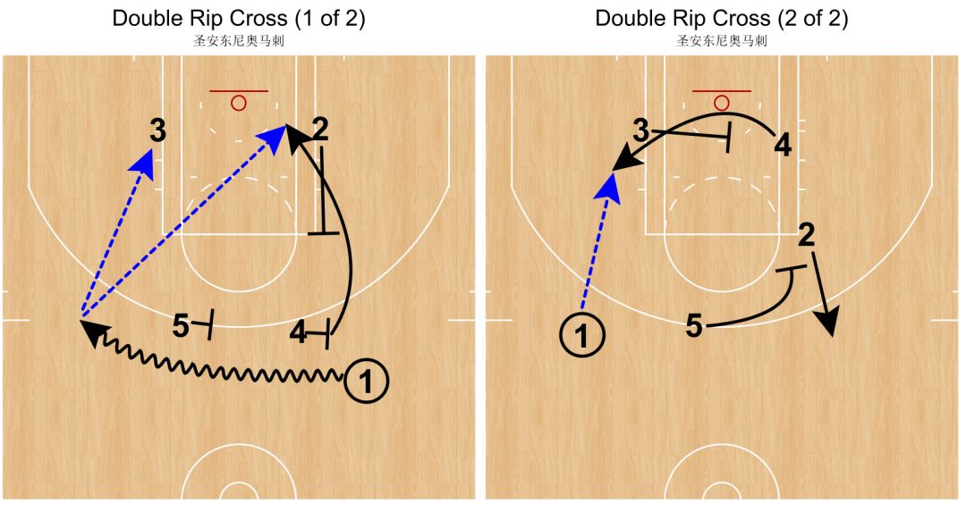 弧顶1号借持球双掩护平行底线运球移动,2号和3号再给5号一个平行边线无球双掩护。5号内切。
