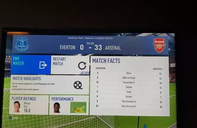 阿森纳客场0-1不敌埃弗顿,暂时落到了英超联赛第四位。赛后,一位阿森纳球迷在网络上晒出自己FIFA游戏用阿森纳踢埃弗顿33-0的照片以泄输球的愤怒。