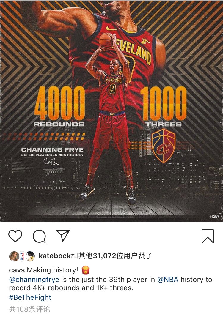 赛后,骑士官方ins写道:“钱宁-弗莱是NBA历史上第36位在抢下至少4000个篮板的同时又命中至少1000个三分的球员。”