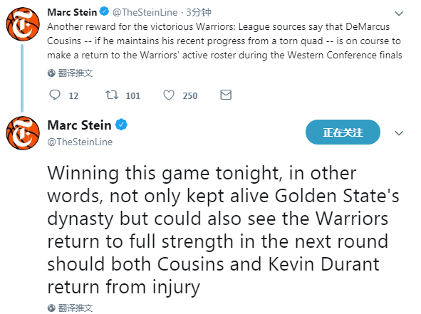据著名记者Marc Stein报道,若考辛斯保持最近的恢复进度,他有可能在西部决赛期间复出。