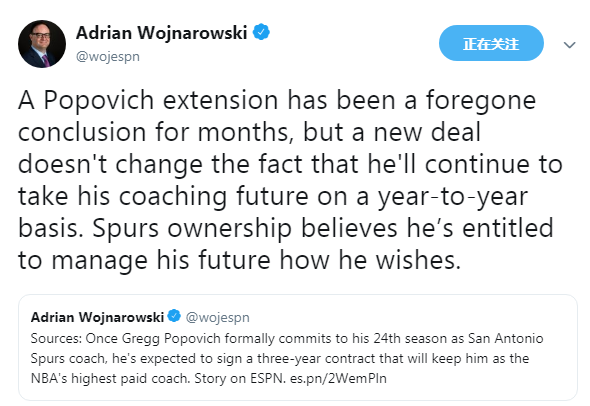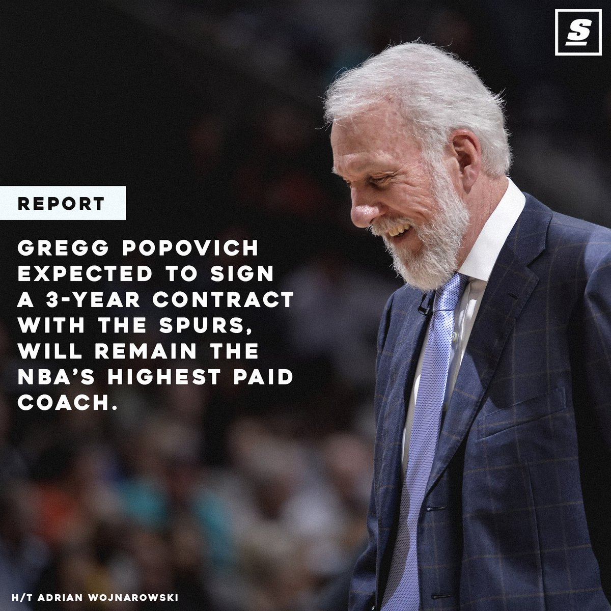 据著名NBA记者“沃神”Adrian?Wojnarowski报道,一旦格雷格-波波维奇承诺回归开启他在马刺执教的第24个赛季,那么波波将与马刺签约三年,新合同也将让他继续拥有联盟教练中的最高薪。