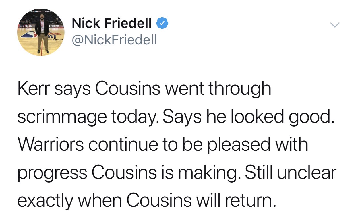 科尔:考辛斯归期未定,一哥基本将在G1复出!