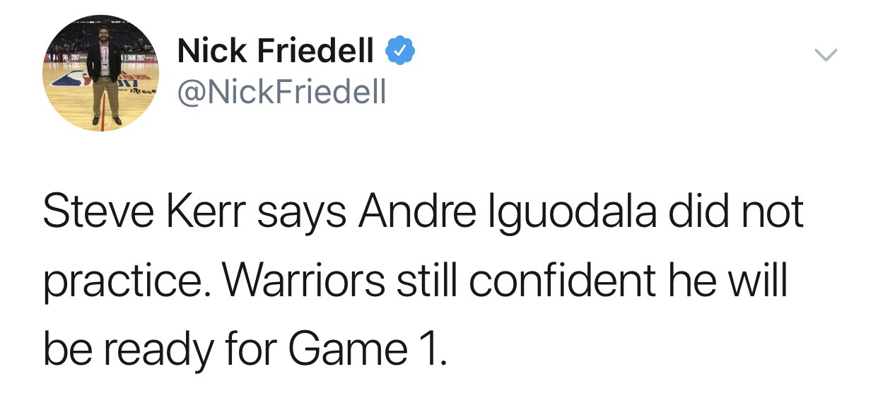 根据Espn记者报道,科尔在今天的采访中说到:伊格达拉没有参加训练,但勇士队仍将相信他会为总决赛G1?做好准备。
