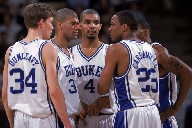 【杜克英雄】巴蒂尔出身豪门杜克大学,大四那年的总统,无疑是NCAA最为闪耀的球员,他以19.9分位列球队第二号得分手,篮板、盖帽、抢断和造进攻犯规次数方面,都是球队第一,率队轻松进入甜蜜四强。半决赛对阵马里兰大学的比赛中,在上半场落后22的情况下,下半场杜克奋力直追,正是巴蒂尔最后的惊人演出:连续投中两个三分,把比分追到只差一分,之后又两罚全中,为杜克锁定胜局,铸就了NCAA四强赛史上最伟大的翻盘。在决赛对阵亚利桑纳大学中,巴蒂尔拿下18分,11个篮板,6次助攻和2个封盖,帮助最终夺得冠军。这一年,巴蒂尔集体名誉个人名誉一把抓,获得全国最佳球员、最佳防守队员、奈·史密斯奖和约翰·伍登奖。