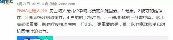 今年季后赛,我没长篇大论的写过前瞻。可只要是遭遇的简短前瞻,凡是能影响比赛的因素中,我都会把心气和态度放在第一位,因为我始终相信,就目前的勇士队而言,最大的敌人只有两个——伤病与他们自己。
