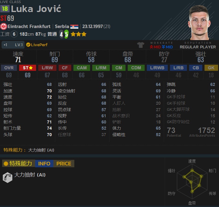 约维奇1998年出生于塞尔维亚,本赛季在各项赛事中为法兰克福出场48次打进27球,还完成7次助攻。