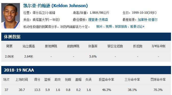 马刺在今年的选秀大会上,用29号签选中凯尔登约翰逊。本赛季NCAA,约翰逊场均得到13.5分5.9篮板1.6助攻。?球员档案:姓名:Keldon Johnson? 身高: 裸足6英尺4.75英寸(195cm)、穿鞋6英尺6英寸(198cm)臂展:6尺9.25寸站立摸高:8尺8寸(264cm)体重: 学校: 肯塔基大学?年级: 大一?生日: 10/11/1999出生地:弗吉尼亚南山(So...也许您还喜欢:世界杯直播 亚洲杯直播 欧洲杯直播 足球直播