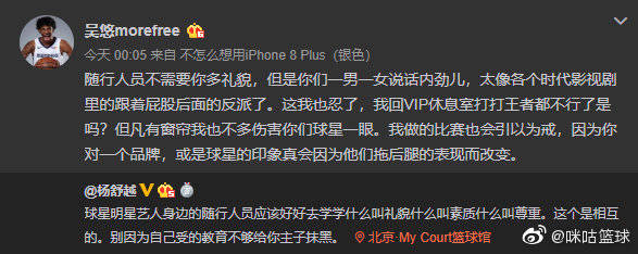 【#哈登中国行# 随行人员于吴悠发生冲突】哈登已开启了由赞助商提供的中国行活动,舟车劳顿后还未安顿下来,自己的随行人员便和中国街球元老级人物吴悠发生了一些不愉快的冲突,据悉是因为哈登中国行的随行人员毫无理由地将东道主吴悠驱逐出场,你怎么看?