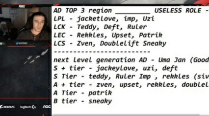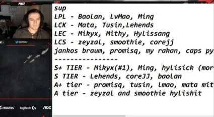 阿p把自己心目中的,每个赛区每个位置的前三都列举了一下,他把自己和自己的队友都排在了s+,毕竟他们刚刚拿到冠军这么排也没毛病,其他位置基本都是主流的看法,你认同么?也许您还喜欢:世界杯直播 亚洲杯直播 欧洲杯直播 足球直播