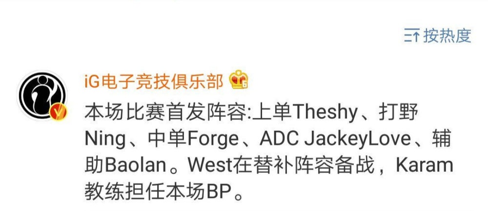 刚才IG的官博宣布了明天的首发阵容,宝蓝回归首发。自从换上替补辅助之后,IG开局战绩不佳,这边肉鸡因为家事回韩国了,IG不得不请出宝蓝来救场了,宝蓝的回归那能够帮助IG取得胜利么?也许您还喜欢:世界杯直播 亚洲杯直播 欧洲杯直播 足球直播