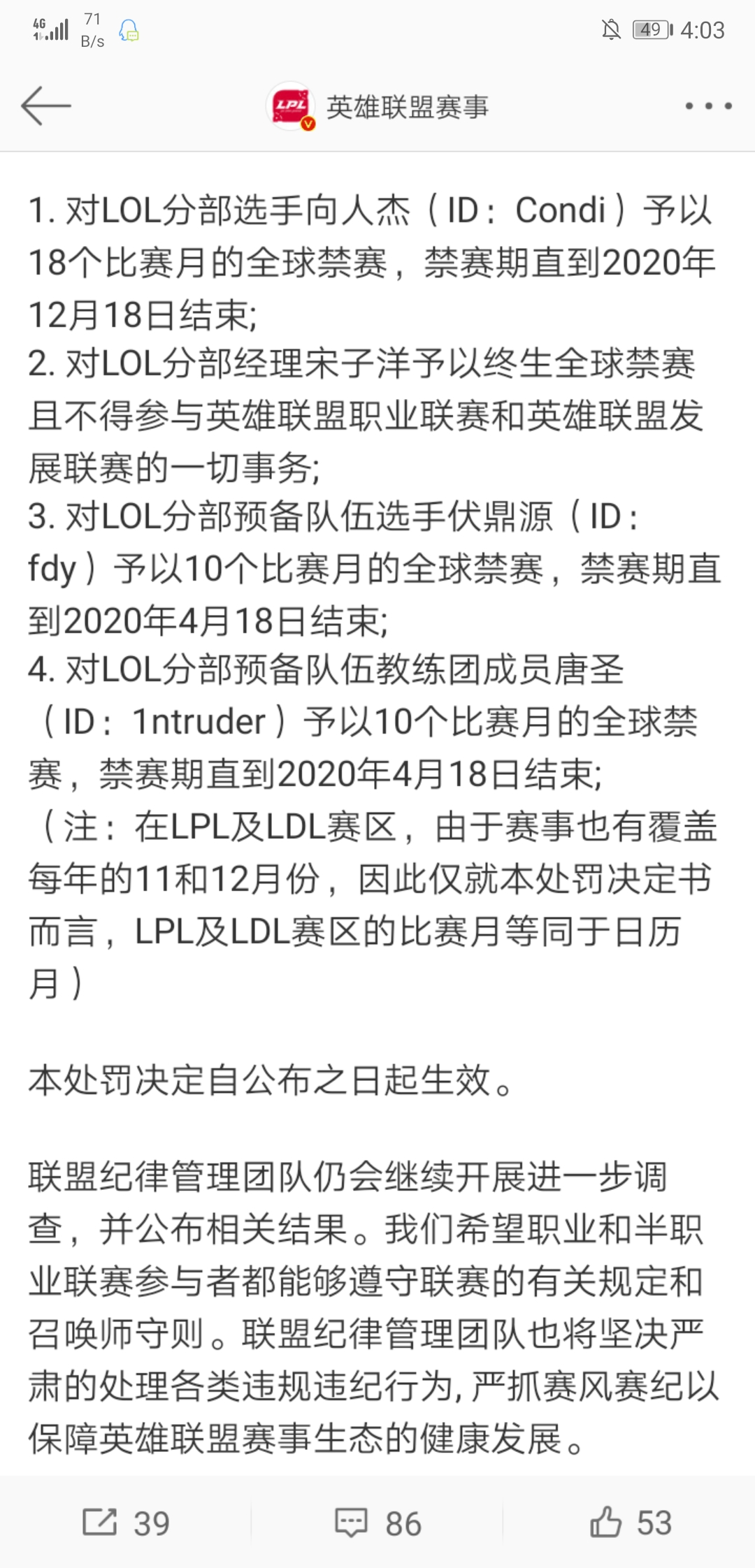 20年年底禁赛期才解禁,康迪这基本翻身无望了8,LGD更是遭到一窝端,诶,职业选手又何必呢